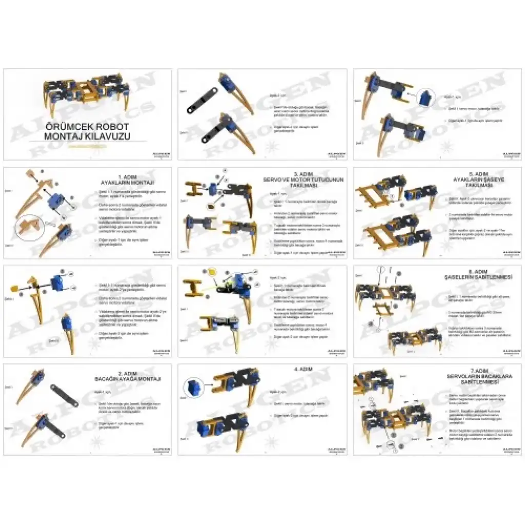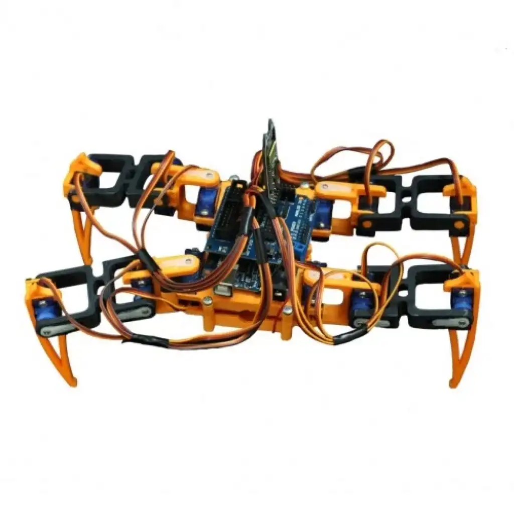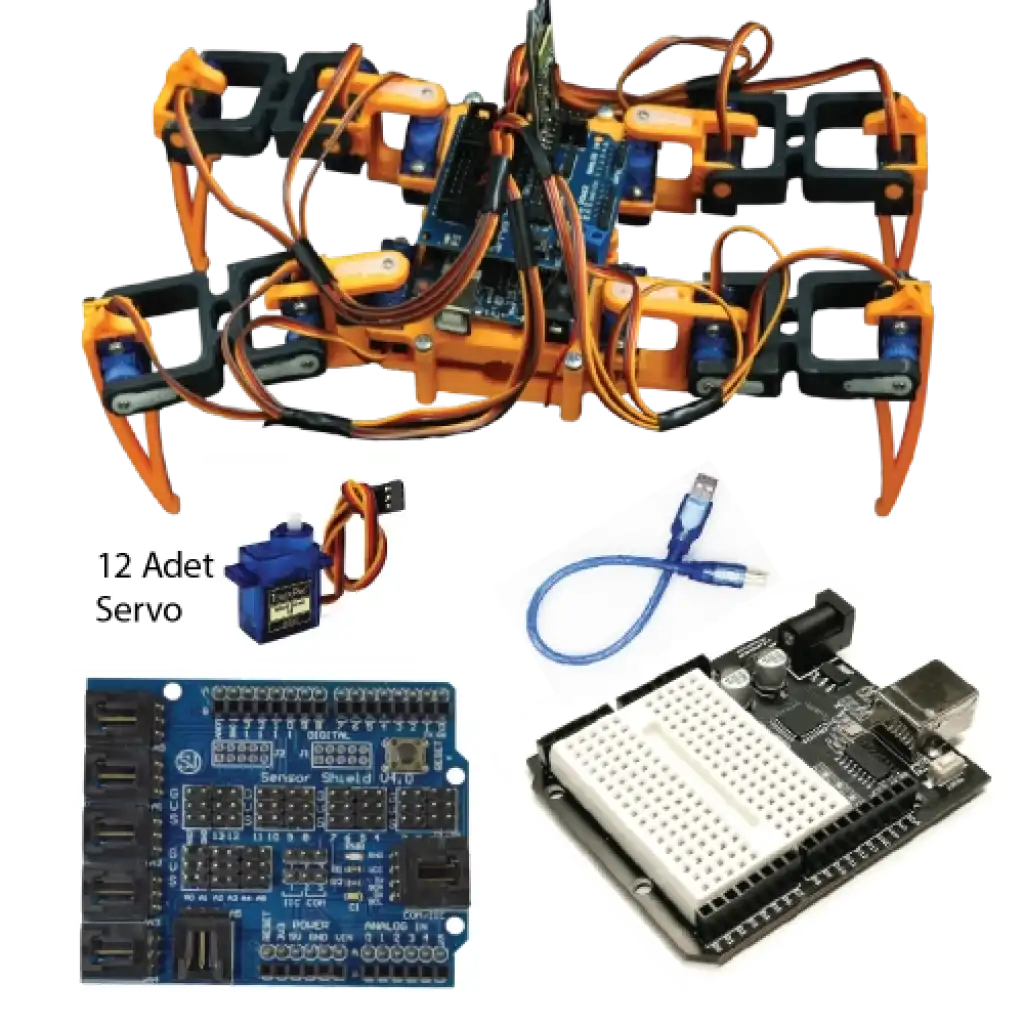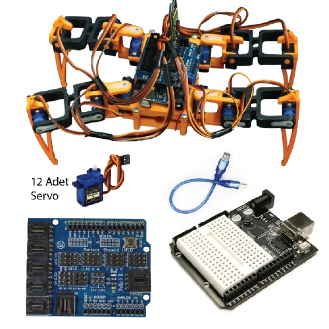 Örümcek robot seti, 3D yazıcılarda üretilen plastik parçalardan oluşan 4 ayaklı bir örümcek robotun Arduino ile uzaktan kontrol edilmesini sağlayan öğretici ve geliştirici kodlama setidir.