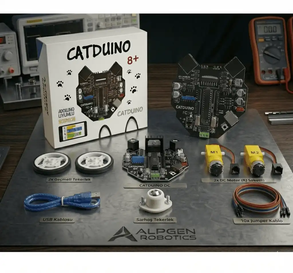 Catduino Arduino tabanlı kodlama setidir. Arduino Uno gibi kodlayabilirsiniz. Catduino tümleşik yapısı sayesinde robotik projelerinizi kablo karmaşası yaşamadan yapabilmenizi sağlar. Catduino üzerinde dahili L298N motor sürücü modülü bulunmaktadır. Ayrıca robotik projelerniz için ultrasonik sensör, bluetooth modülü ve servo motor girişleri bulunmaktadır.